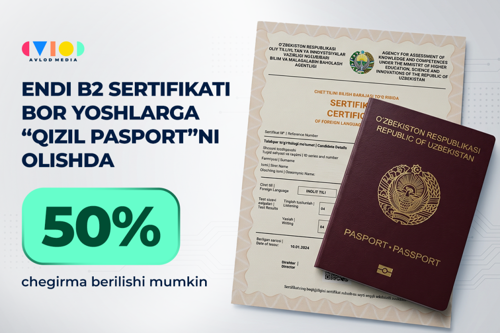 Endi B2 sertifikati bor yoshlarga “qizil pasport”ni olishda 50% chegirma berilishi mumkin